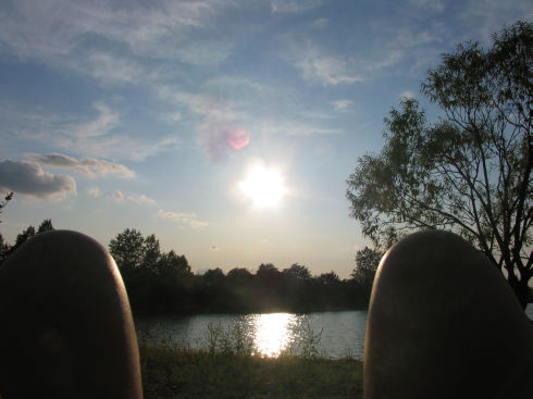 Ami engem illet, én megelégedtem azzal, hogy erkölcsi támogatást nyújtsak barátaimnak, s amikor eltávolodtak, a lefeküdve a felhőűzés nemes, ámde kevésbé kimerítő sportját űzzem. A verseny közben benéztem barátaimhoz is, ahogy a telep legfiatalabb lakóihoz volt szerencsém: egy hattyúpárhoz és három kicsi „rút kiskacsához”. Bevallom, sok mindent láttam már életemben, de újdonság volt látnom, hogy az egyik szülé fölemelte kissé a szárnyait, középen egy kis vályút képezve és ott szállította a kicsinyeit. Sajnos, ahogy közelítettem hozzájuk, olyan hangosan adták tudtomra nemtetszésüket, hogy jobban láttam, ha nem zargatom őket. De azért, egy képet tudtam készíteni erről az élő „anyahajóról” (a jobboldali felnőtt hattyú szárnyai között látható az egyik kicsike): Később már megbékültek velem... Közben szerencsésen megkezdődött a „lábtenisz” verseny is (bár nem nagyon értek a sporthoz, de nekem annak tűnt).